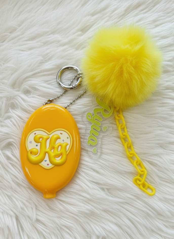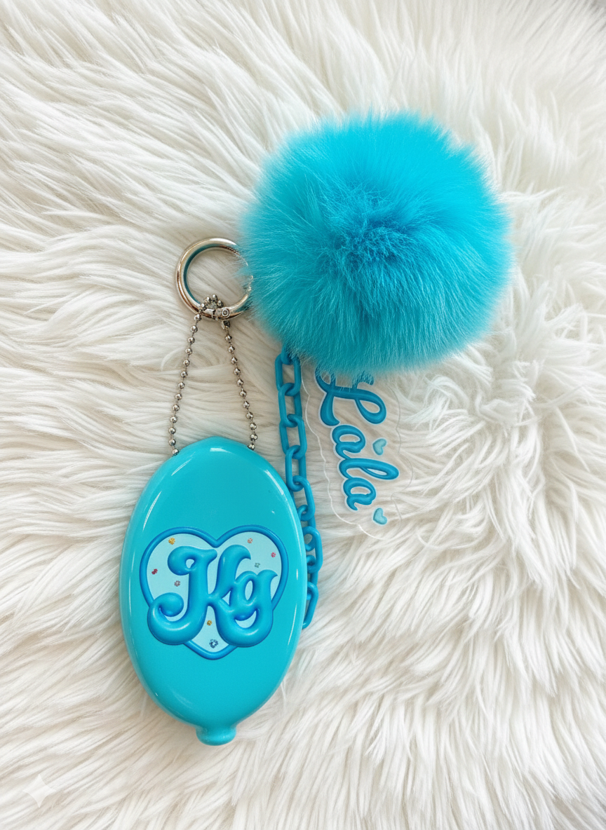 カラビナにコインケース、チェーン、ファー、ネームプレートがついた